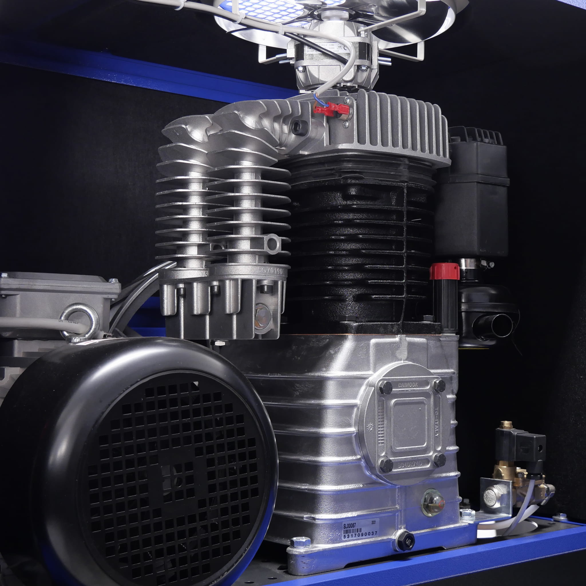 Kompresor wyciszony CP55S270SD 5,5 kW, 400 V, 11 bar, zbiornik 270 l, rozruch gwiazda-trójkąt. Kompresor wyciszony / cichy kompresor. Ten model wyciszonego kompresora ZionAir jest produkowany we Włoszech zgodnie europejskimi normami jakości i jest wyposażony w pompę Chinook-Shamal K30. Dzięki temu kompresor jest energooszczędny oraz łatwy w użyciu i utrzymaniu, a także zapewnia maksymalną wydajność przy minimalnym poziomie hałasu. Przełącznik gwiazda-trójkąt umożliwia stopniowy rozruch ciężkiego silnika. Osobną skrzynkę z przełącznikiem gwiazda/trójkąt trzeba zamontować na ścianie. Kompresor jest połączony ze skrzynką przełącznika kablem o długości 1,4 m. Oprócz tego kompresor jest wyposażony w system „wentylacja na żądanie”. Wykorzystywane są w nim wbudowane wentylatory, które się automatycznie włączają przy wzroście temperatury kompresora.