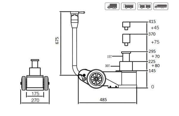 Udźwig: Wysokość minimalna: Wysokość maksymalna bez nakładek: Wysokość maksymalna z nakładkami: Stopień 1 – 30 ton = 80 mm: Stopień 2 – 15 ton = 70 mm: Nakładki 2 sztuki: Wymagane ciśnienie powietrza: Średnie zużcie powietrza: Podłączenie: Wga netto: Wymiary w opakowaniu: Waga brutto: Uwaga: |