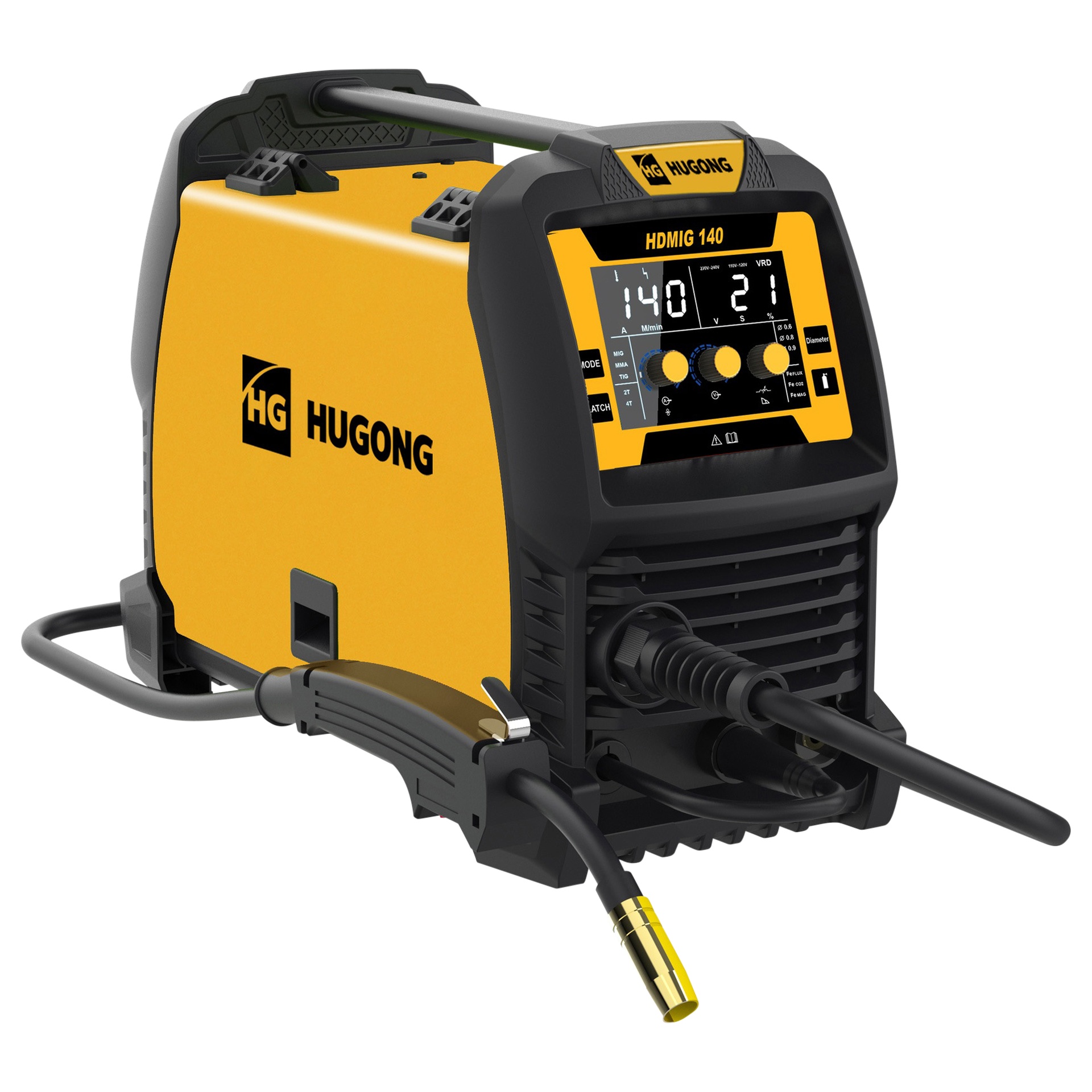 Spawarka MIG - HDMIG140 -140A. Hugong HDMIG140 to kompaktowa, inwertorowa spawarka 3-w-1 przeznaczona do spawania metodami MIG/MAG, MMA (elektroda) oraz Lift-TIG. Urządzenie jest lekkie i łatwe w transporcie, dzięki czemu doskonale sprawdza się w pracy mobilnej. Dzięki technologii przebiegu IGBT oraz czytelnemu wyświetlaczowi HD LED możliwa jest precyzyjna regulacja parametrów łuku spawalniczego. Model HDMIG140 umożliwia spawanie stali, stali nierdzewnej, aluminium oraz drutu rdzeniowego (flux) i jest szczególnie polecany do cienkich blach.