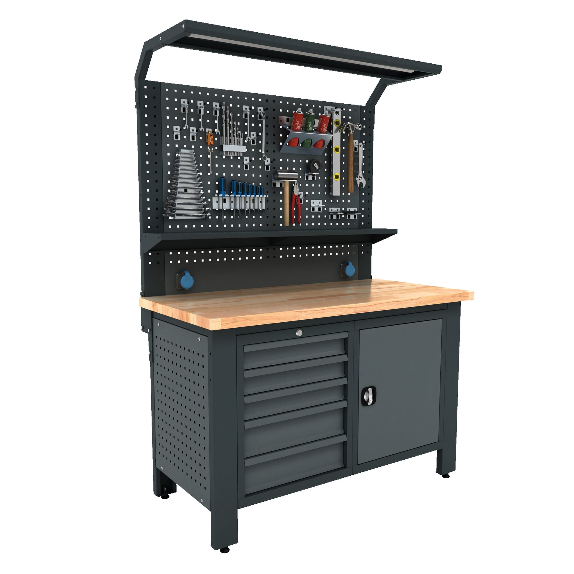 Stół roboczy przemysłowy – WBG01 Stoły robocze przemysłowe. Stoły robocze marki BULLRAM są projektowane i produkowane z myślą o profesjonalnym użytkowaniu w warsztatach lub garażach. Przemyślany design stołów roboczych pozwala na efektywniejsze wykorzystanie przestrzeni roboczej i utrzymanie narzędzi w porządku. Szuflady stołów roboczych charakteryzują się dużą nośnością i dzięki solidnym stalowym szynom przemysłowym z łożyskami kulkowymi cechują się długowiecznością. Dodatkowo stoły robocze wyposażone są w regulowane nogi, dzięki czemu stabilnie stoją nawet na nierównych powierzchniach. Wszystkie szafki i szuflady w stołach roboczych są indywidualnie zamykane i zabezpieczone zamkiem cylindrycznym. Blaty robocze stołów roboczych mają powłokę PVC z sześciokątną warstwą antypoślizgową. Ten stół roboczy przemysłowy jest wyposażony w solidne, energooszczędne oświetlenie LED z elegancko wykończonym paskiem oświetleniowym. Stoły robocze są sprzedawane bez akcesoriów, które można dokupić osobno.