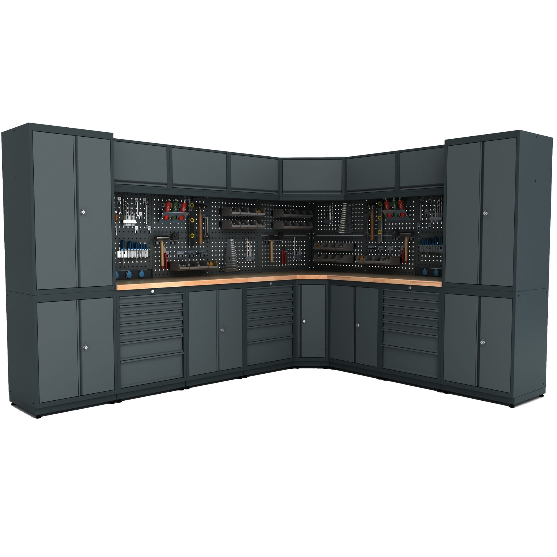 Stół warsztatowy EXPERT – BGMODJ Modularne wyposażenie warsztatowe / kompletne miejsce pracy / pełna konfiguracja warsztatowa moduł J. Z wyposażeniem warsztatowym Expert marki BULLRAM każdy warsztat można urządzić według własnych preferencji. Wyposażenie zapewnia profesjonalny wygląd, oferuje idealną przestrzeń do różnych prac oraz jest wyposażone w osiem gniazd 230V i wystarczającą ilość miejsca do przechowywania narzędzi. Ten zestaw Expert jest wyposażony w energooszczędne oświetlenie LED i estetycznie wykończoną listwę oświetleniową. Wyposażenie warsztatowe jest dostępne bez akcesoriów. Wszystkie elementy z serii Expert są dostępne osobno, co pozwala na stworzenie własnej aranżacji warsztatu, a ten moduł jest jej przykładem. Moduł wyposażenia warsztatowego BGMODJ Expert składa się z: