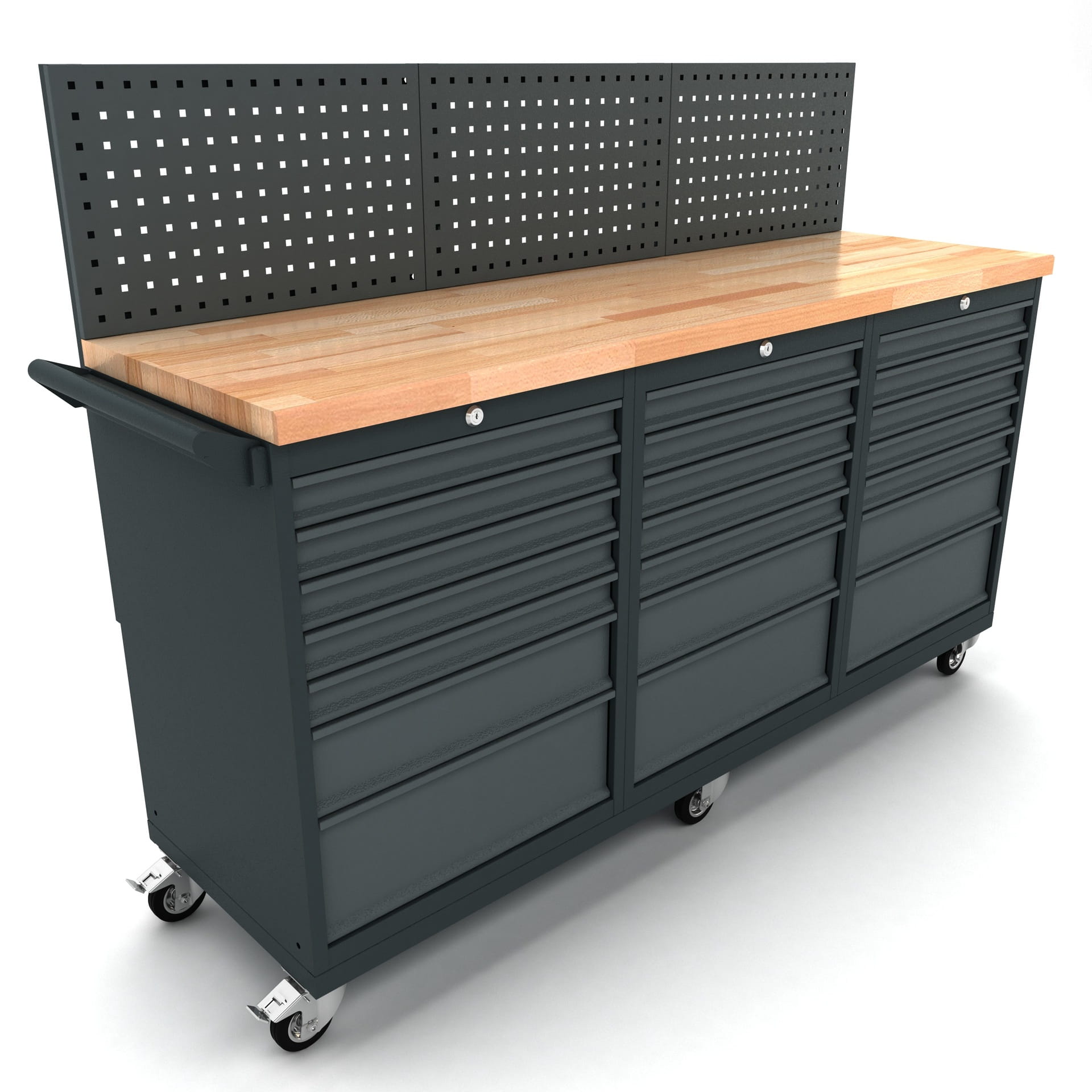 Stół warsztatowy mobilny potrójny - WBG186M08 - Mobilna stacja robocza z 3x 7 szufladami i panelem narzędziowym. Mobilna stacja robocza BULLRAM wyposażona w dwa moduły szuflad, każdy z 7 w pełni wysuwanymi szufladami na prowadnicach kulkowych, oraz zintegrowany panel narzędziowy.