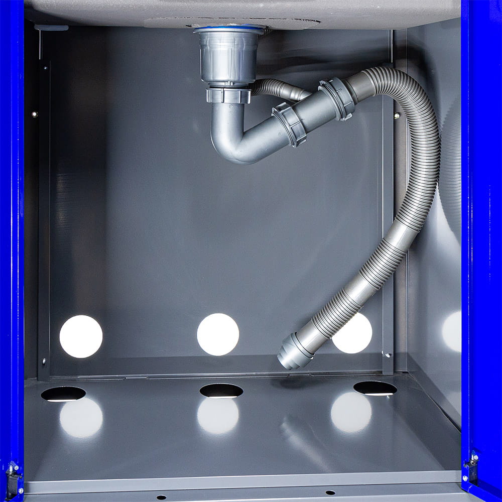 Szafka dolna z umywalką - GC68WS - jest wyposażona w umywalkę, dwoje drzwi oraz w zestaw z kranem i dozownikiem mydła. Za drzwiami znajduje się przestrzeń do przechowywania. Produkt dostępny osobno i może być łączony z innymi szafkami dolnymi.