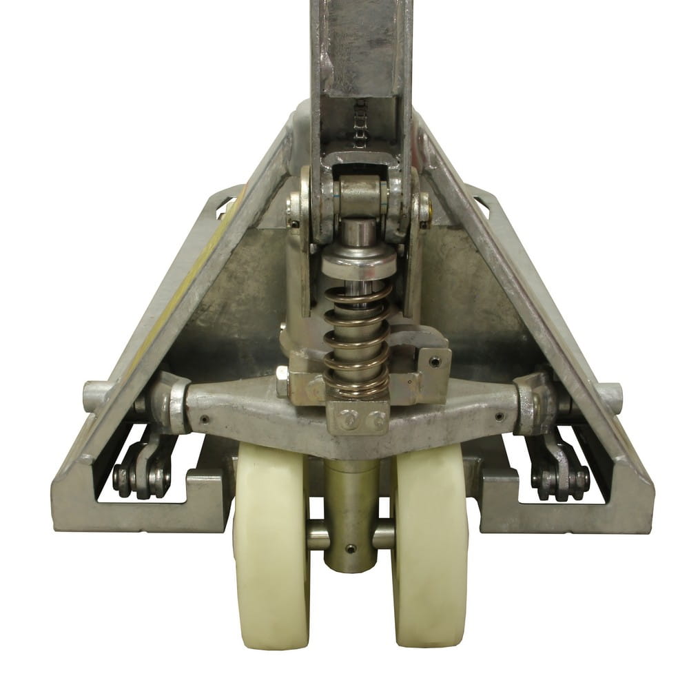 Wózek paletowy z galwanizowanej stali 2500 kg – PT25L115G. Wyposażony w podwójne koła. Koła wykonane z nylonu gwarantują żywotność i cichą pracę wózka. Urządzenie klasy przemysłowej nadające się do codziennego użytku.